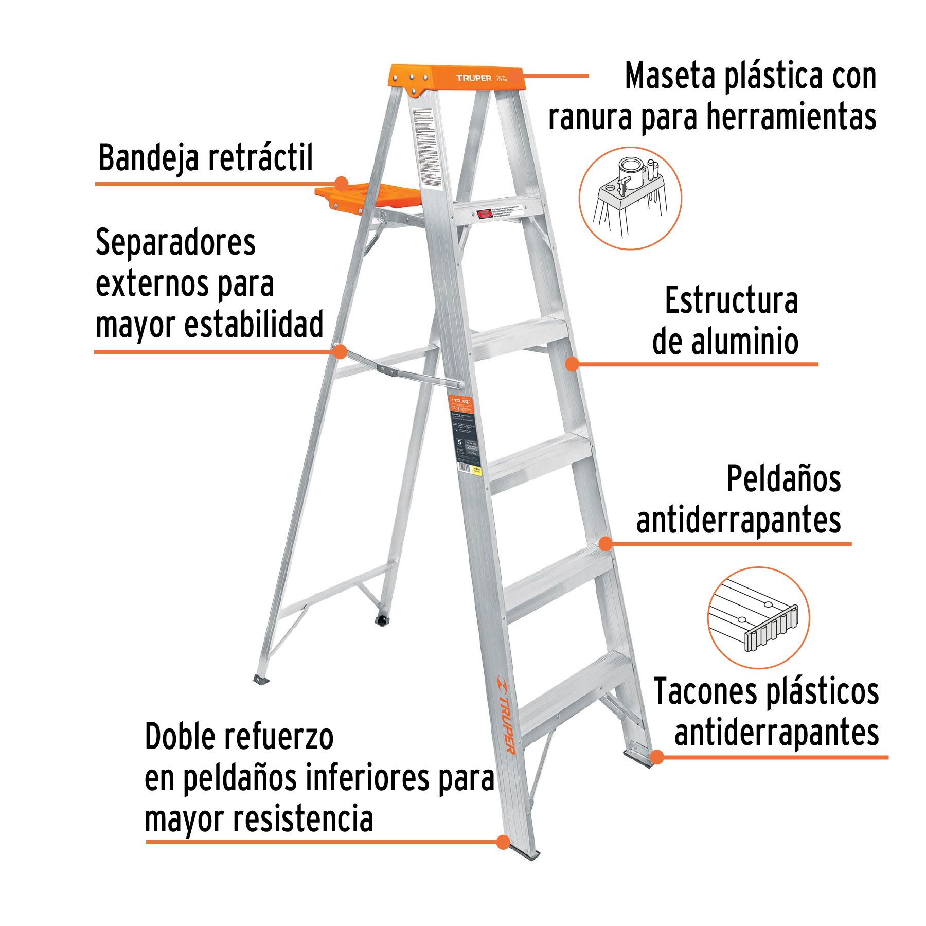 • Doble refuerzo en peldaños inferiores para mayor